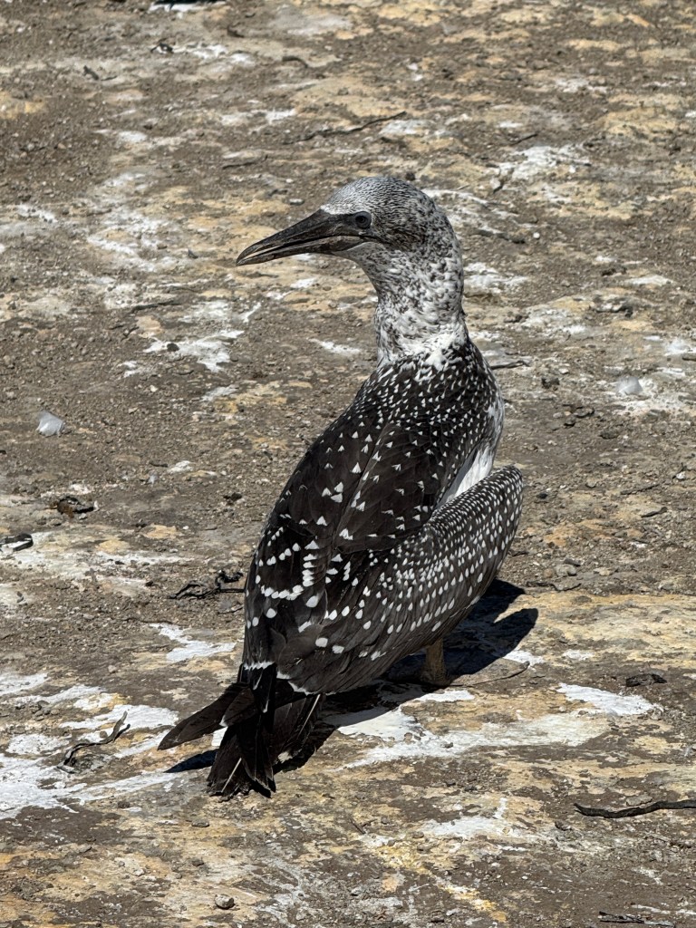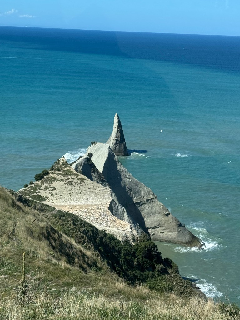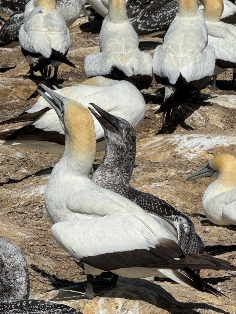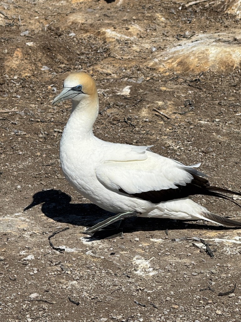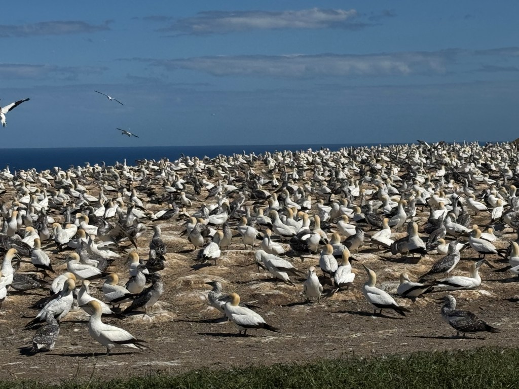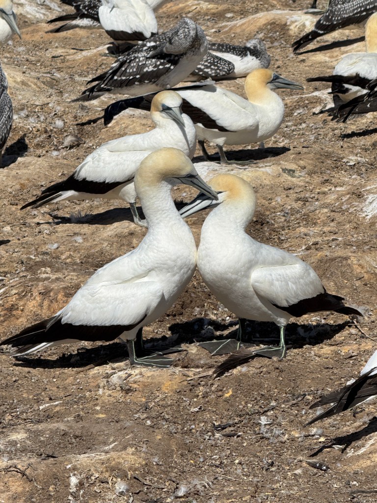 The main objective to visit Cape Kidnappers was to see colonies of Gannets: beautiful, large (6-foot wingspan) white birds with peachy-colored heads and long bills. The colony area is roped off to keep people out of their nesting area, but the birds have no fear of the human visitors. They appear to be very social, moving around within the colony, and the adult birds flying in and out. The younger birds, gray and white, do not fly yet. The first time they fly is when they take off to migrate to Australia in late summer… they will leave very soon.
